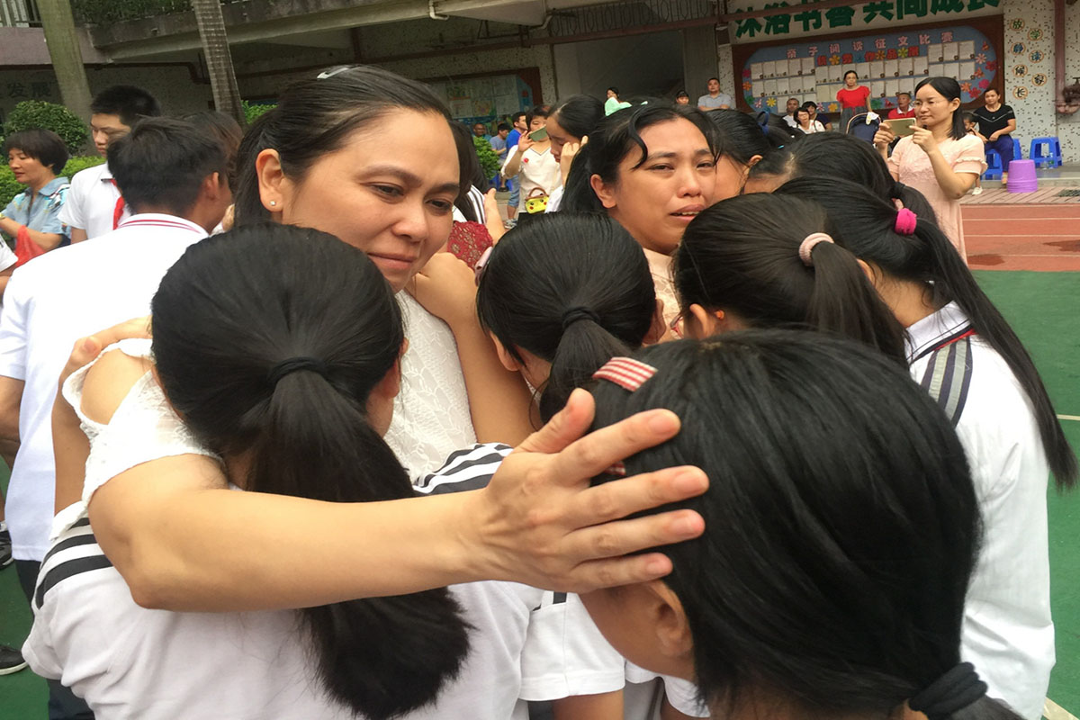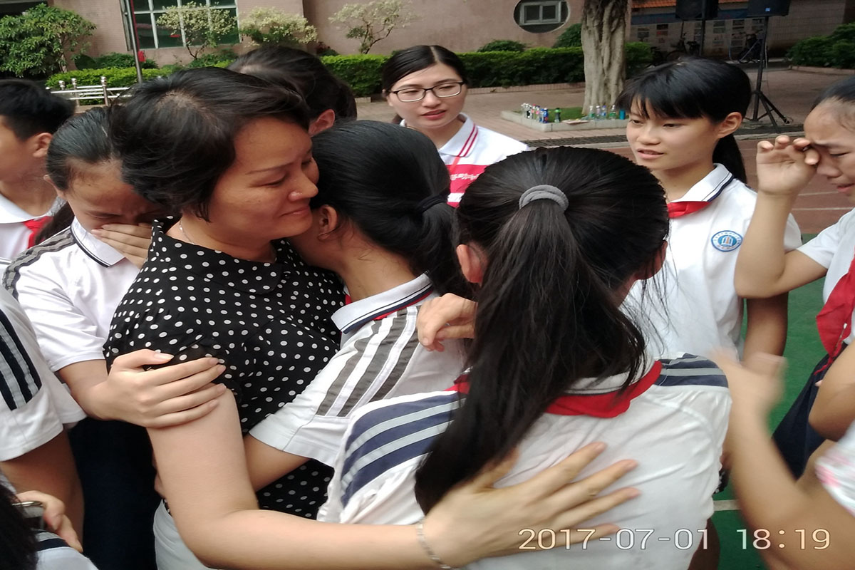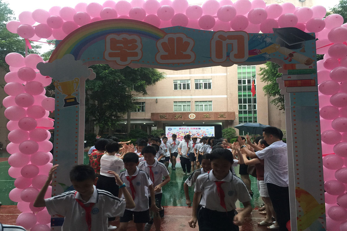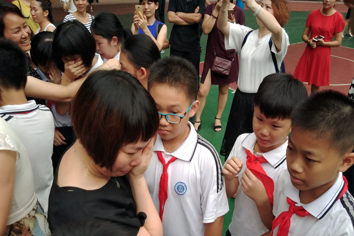 在倾盆大雨中,2017年东莞市莞城中心小学分校六年级毕业生与老师在毕业门前做最后的击掌告别,踏着坚定的步伐,以高昂的士气迎接未来的挑战。
