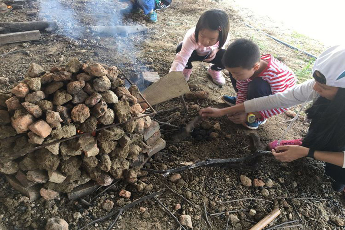 火终于升起来了!往搭好的窑洞里,一起填进去干柴,农场的叔叔拿来煤气罐,对着窑口一阵“扫射”,窑洞里登时浓烟四起,我们个个被熏得眼睛都睁不开了。教练说,要等窑洞烧40分钟左右,等搭窑的石材都被烧红的时候,把用锡纸包起来的鸡塞进去,然后把窑洞打塌下去,用烧红石材的余温把鸡给焗熟。