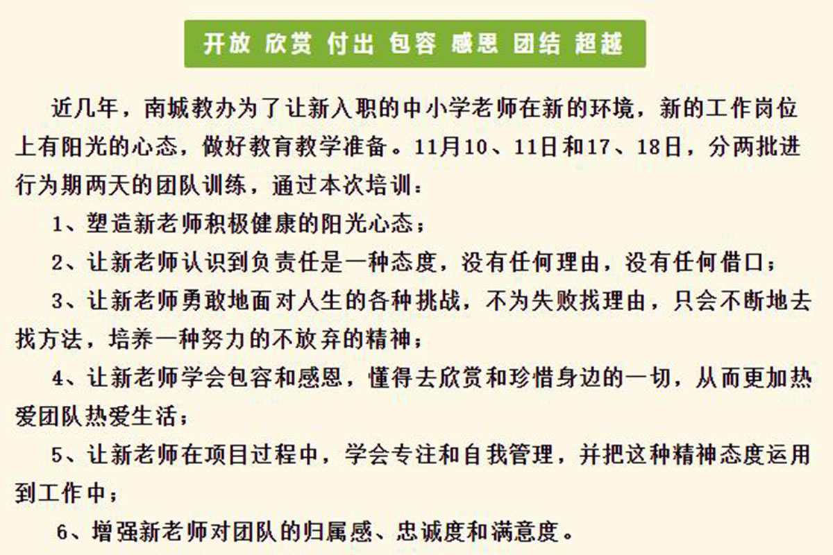 为期一个月的时间里,南城街道的新教师们分两批接受“快乐融合,团结合作”的两天一夜主题系列培训,在感动中国教练团的带领下,通过有趣的团队游戏活动,争取集体荣誉,打造最具战斗力团队!