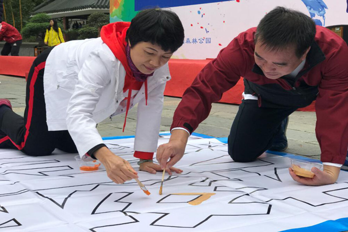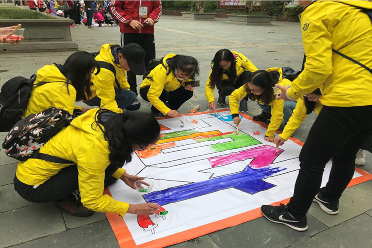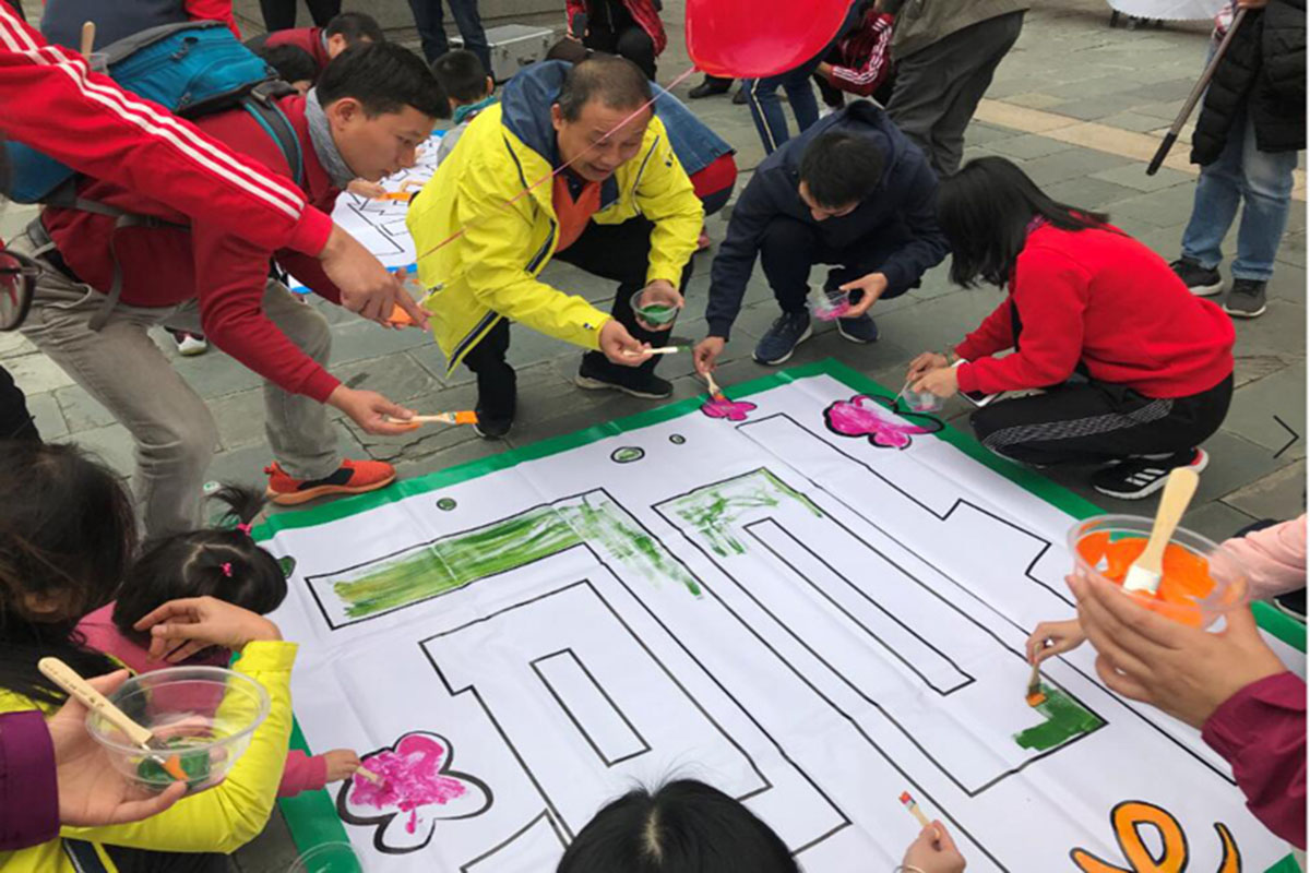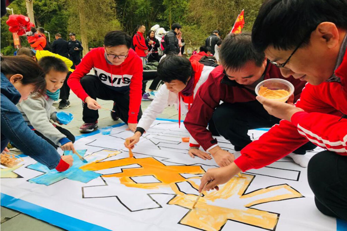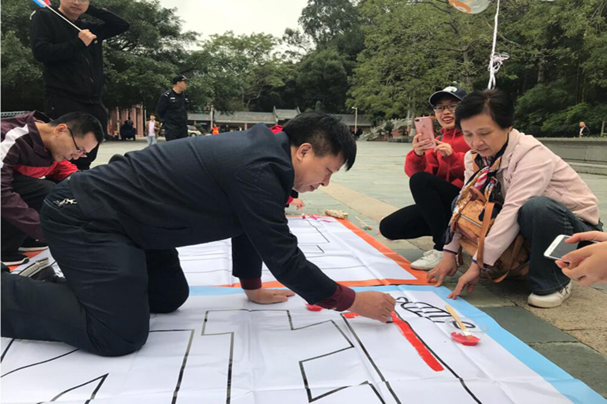 上午10点多,到达古庙广场的全体人员分组进行了“神笔马良”活动。大家在梁局的带领下纷纷拿上五彩画笔,齐齐动手,点墨的点墨,上色的上色,指导的指导。不大一会功夫,不同的色彩共同描绘出了大型绚丽的喷图彩绘:“攀高峰、绘教育”,“让每一个学生受到最适合的教育”,抒发了全局干部职工为东莞教育发展而奋斗的豪迈情怀。