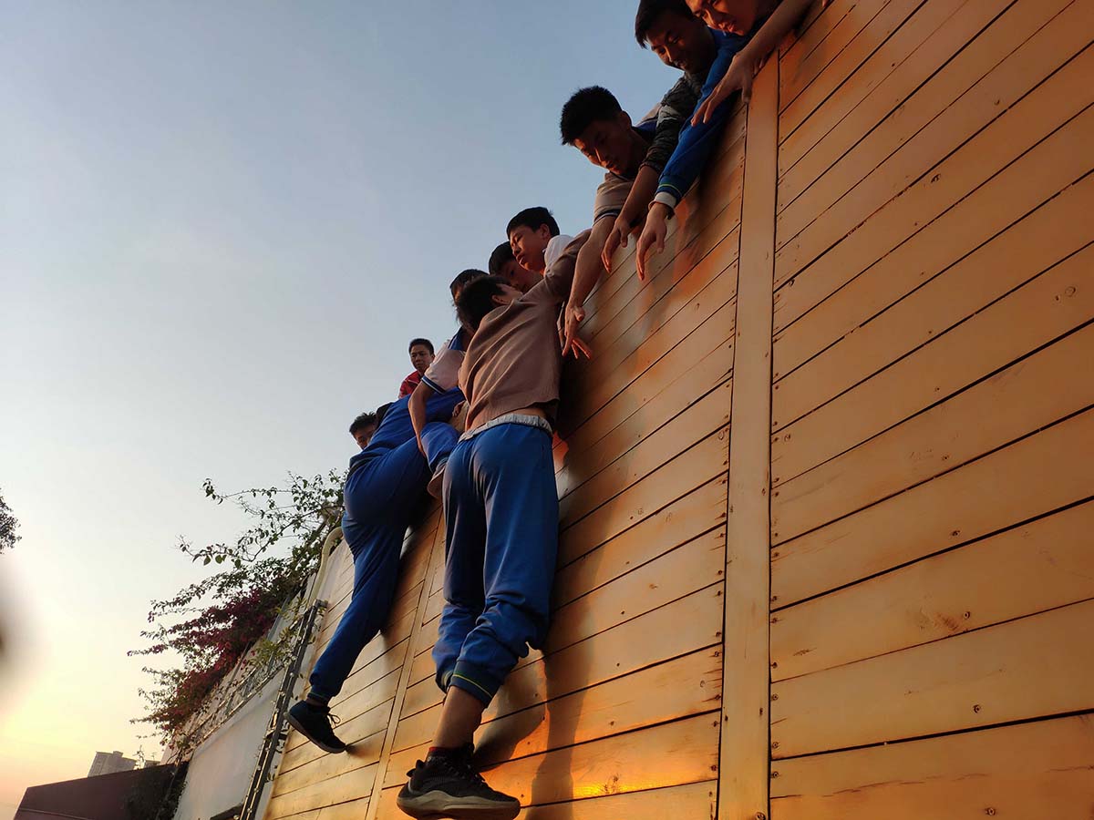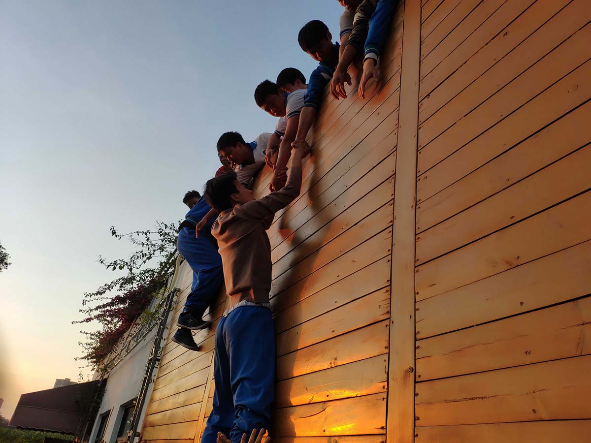 就是这班黄埔职中的同学们,硬要来挑战感动中国的毕业墙。红豆教练说:感动中国的毕业墙是最难爬的!他们却无一退缩,勇敢接受挑战。最后所有男生都在上面拉人,所有女生在底下做保护,扛起了重任!