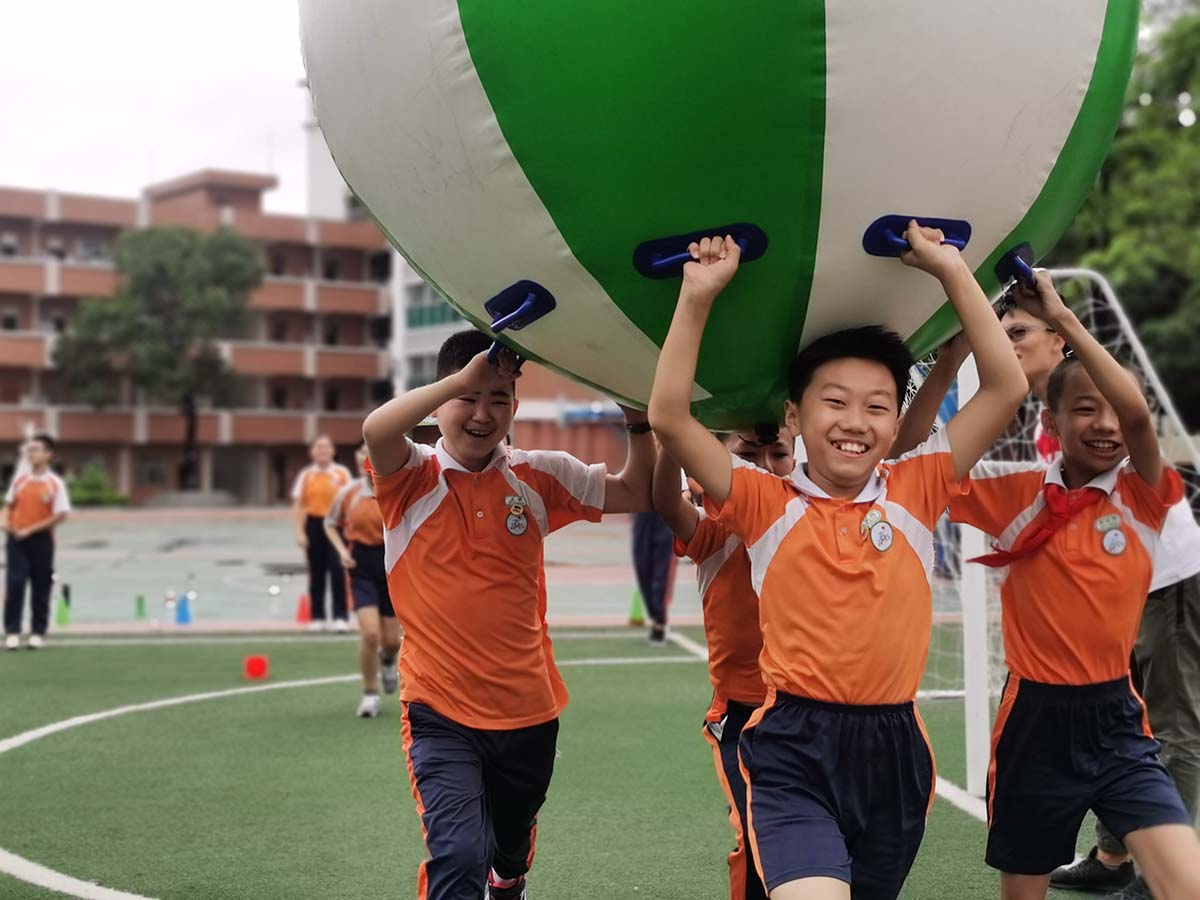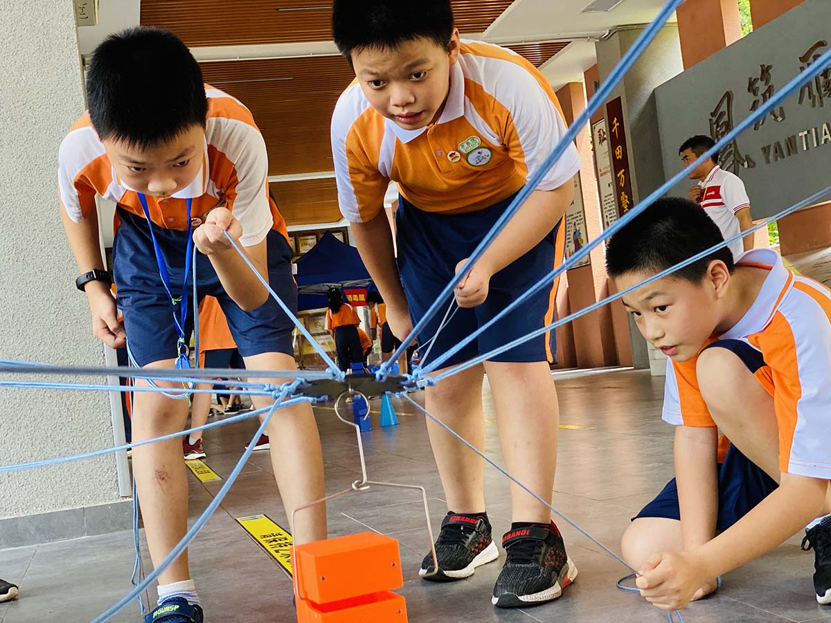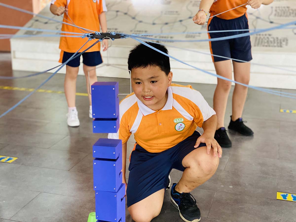 活动开始,在轻松、欢快的热身游戏后,五年级的同学们开始了一项特殊的任务——“合力建塔”。