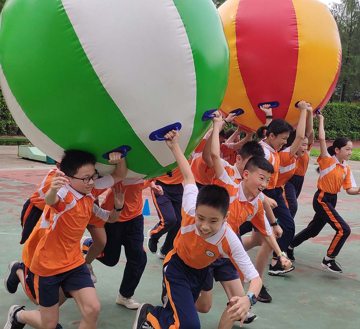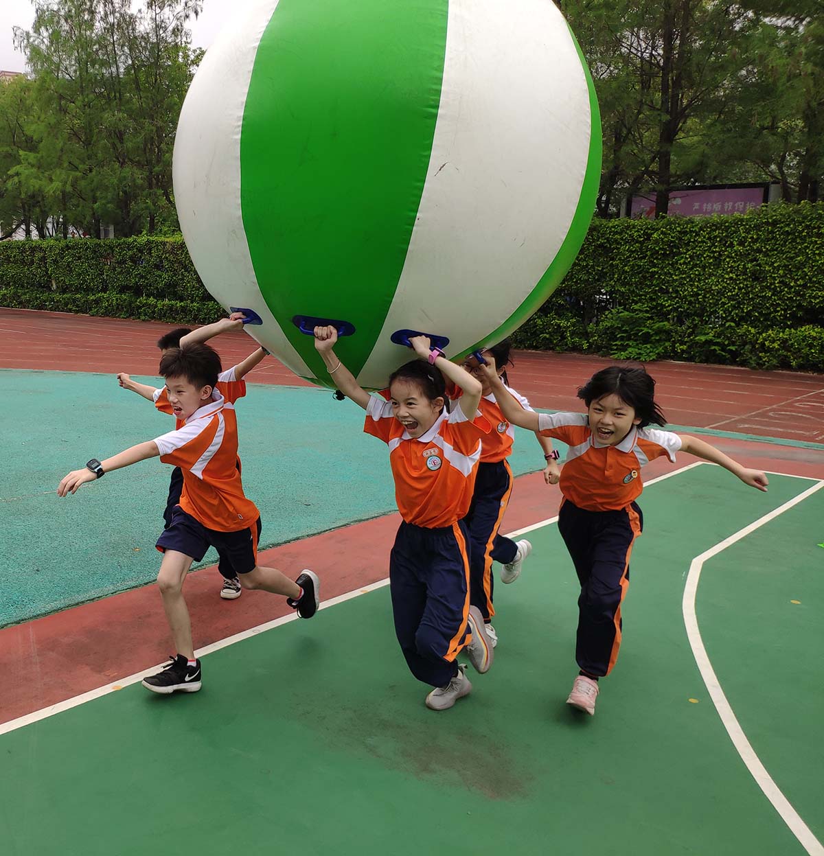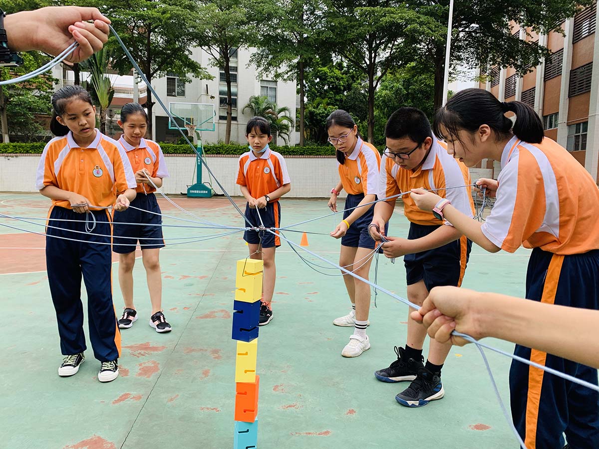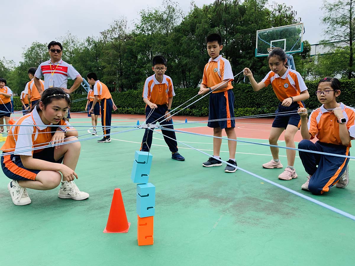 同学们手牵绳子,将模块逐一搭建起来,孩子们屏住呼吸、神情专注投入盯着积木移动的方向,在最后成功搭建出一座座高塔时,欢呼声响彻校园。
