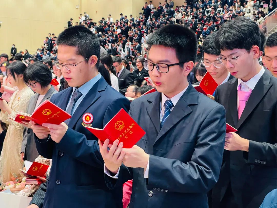 一份庄严神圣的成人礼——《中华人民共和国宪法》,全体高三同学把《宪法》捧于胸前,在国旗下庄严宣誓,遵纪守法、爱祖国、爱人民、有远大理想,句句铿锵有力的誓言展现出成年后的责任与斗志,迎接成年后的责任与义务。同学们昂首阔步,满面春风,走上红地毯,迈过成人门,敬礼、击掌、拥抱、献花,和家人、朋友、老师、同学们合影记录下朝气蓬勃如旭日般的年华。善美励学,十八而志!人生搏志当为先,不负韶华舞流年,让我们一起践行青春誓言,立志扬帆远航!