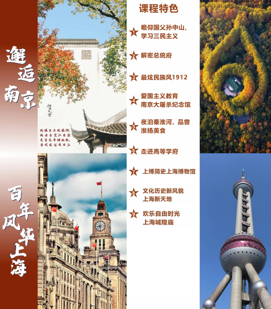 今年暑假,感动中国教练团将带领孩子们走进上海和南京。上海,欣赏迷人外滩,探索百年建筑群的故事,体验科技的生物万象,品尝上海小吃。南京,寻访孙权和朱元璋的历史故事,学习报恩文化,瞻仰孙中山,学习三民主义,解密总统府,南京大屠杀纪念馆爱国教育,夜泊秦淮河,品尝淮扬美食……通过行,看,听,问,记,研,学七个维度开展上海·南京文化探索之旅。