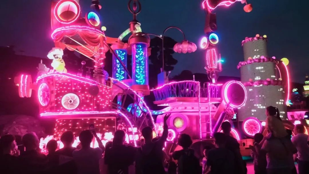 到了晚上,绚烂的烟花在空中炸开,闪亮的花灯车在街上游行,在欢声笑语中,愉快的一天圆满结束了。