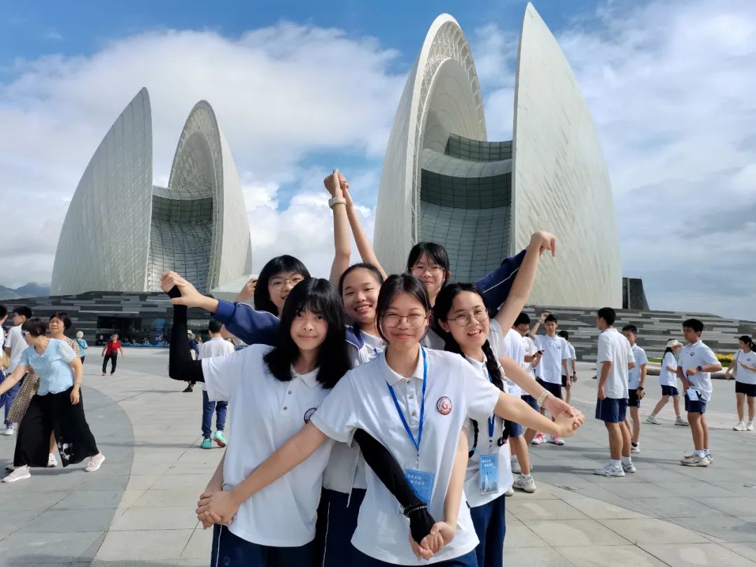 日月贝是全国唯一在海岛上的歌剧院,也是珠海的标志性建筑之一,来到日月贝拍照打卡,同学们在惊叹的同时也领略到了日月贝独特的建筑艺术魅力,欣赏到了辽阔无际的蔚蓝大海。在日月贝前,同学们摆出各种姿势拍照打卡,势必要成为全场最靓~