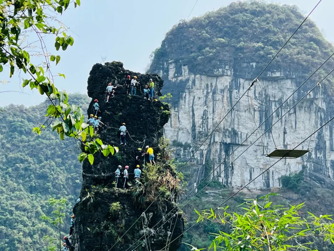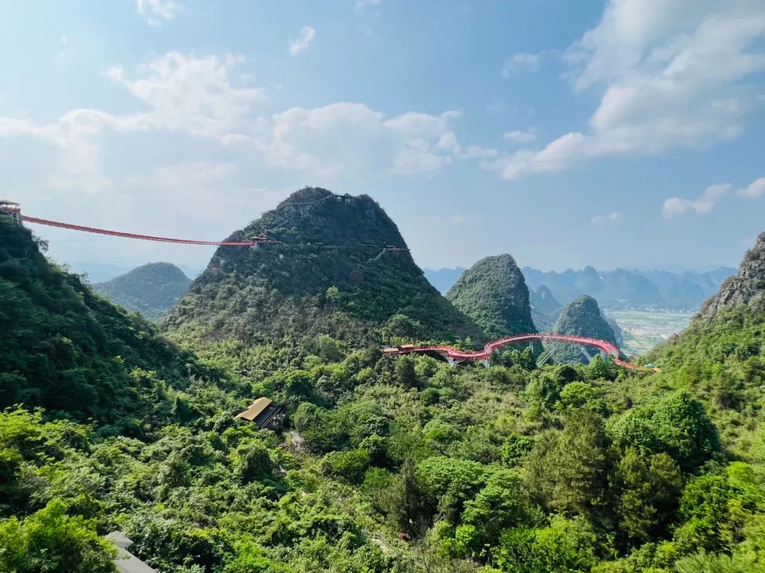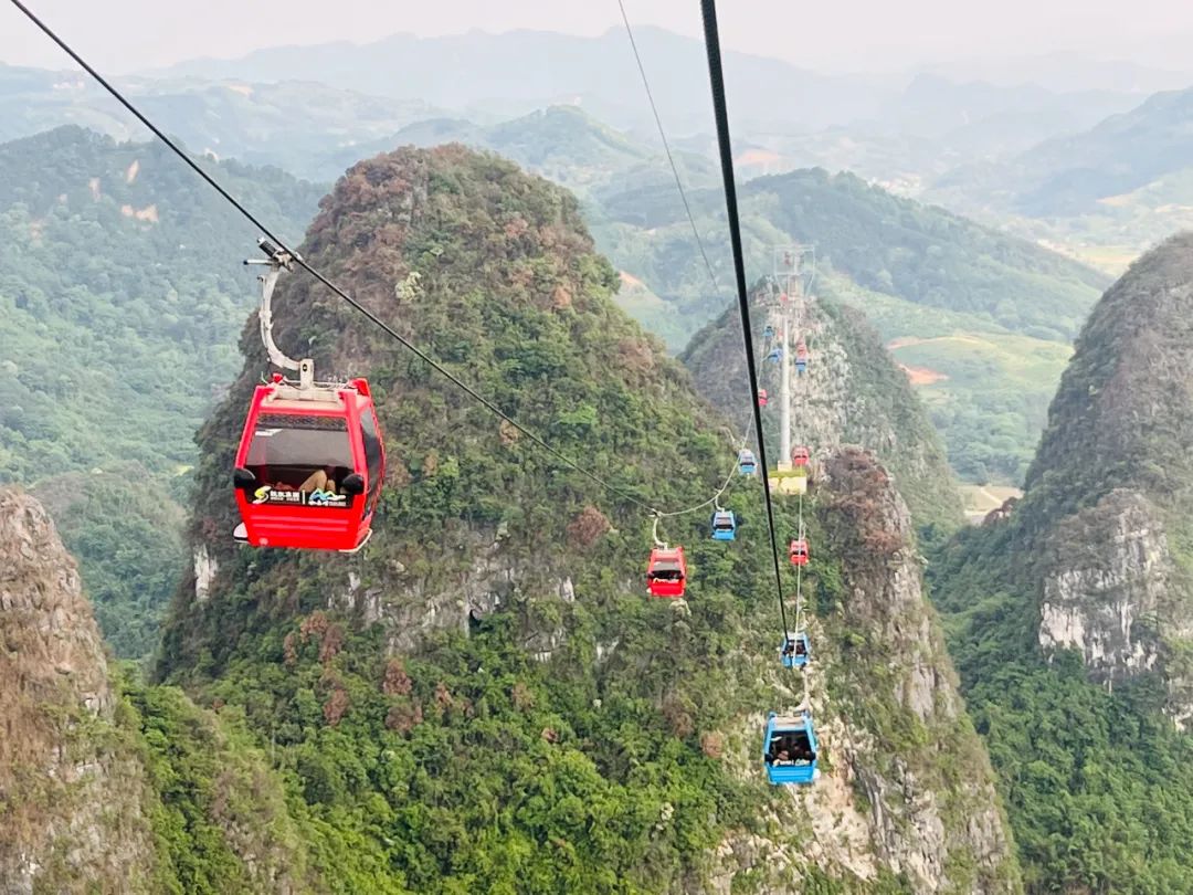 登上全景缆车,鸟瞰浩瀚无边的锥状喀斯特峰林美景,漫步在索桥、玻璃栈道相连的山峰中,