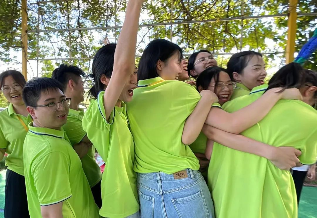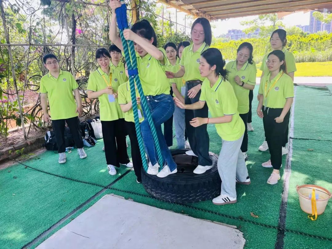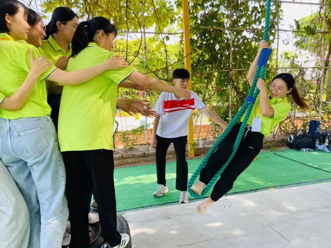 破冰热身活动之后,队员们斗志昂扬,泰山绳项目中团结互助,当队友从对面借助绳子之力“飞跃”过来时,