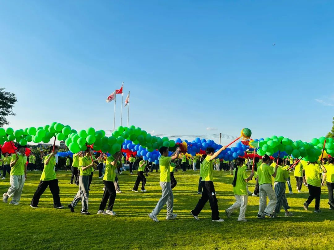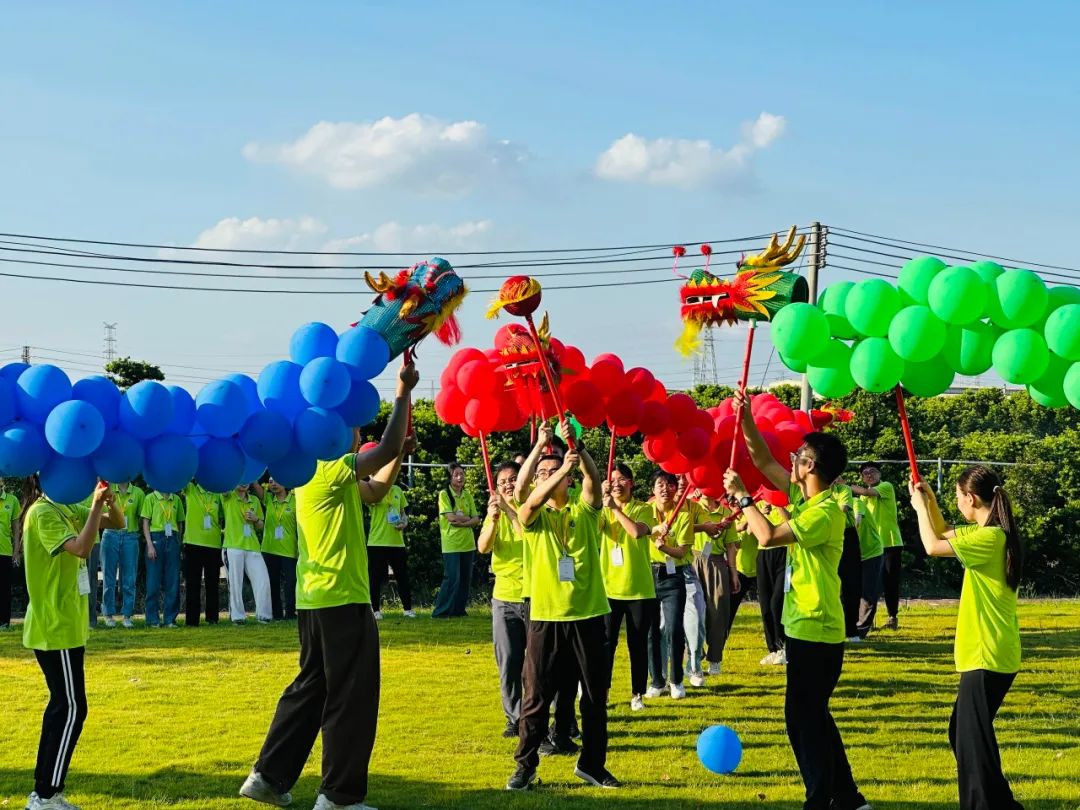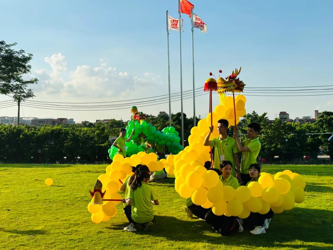 舞龙组的队员在蓝天白云下舞动团队齐心协力制作好的巨龙,在大家的努力下,