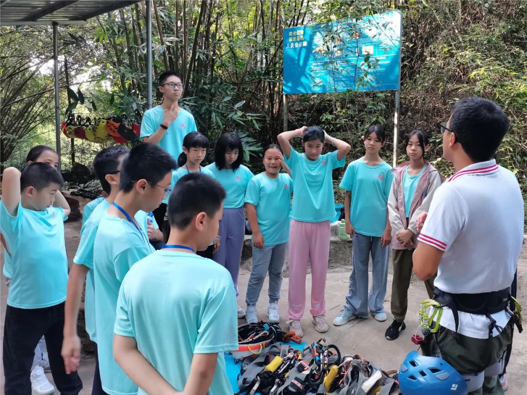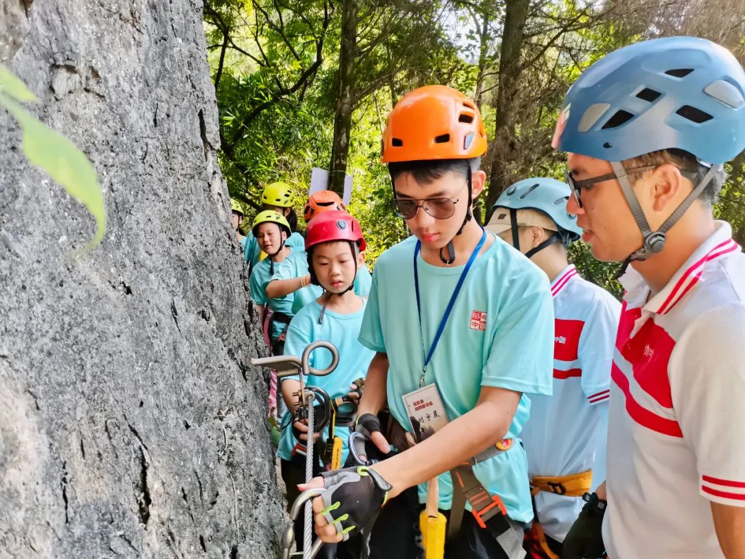 阳朔营第二天,同学们在教练团的指导下开始初步了解学习攀岩相关等户外知识,