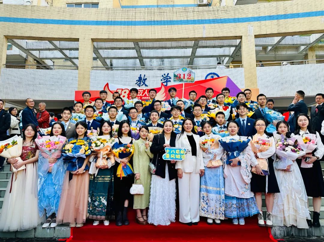 成人礼成,簇拥着鲜花掌声,同学们踏上长长的红地毯,走过成人门,与老师同学击掌加油,跟家人朋友拥抱致谢,每个人身上洋溢着青春的气息,眼中是发光的希冀,在操场、草地,我们合影留念,记录下这美好的一刻,这朝气蓬勃发着光的滚烫青春!